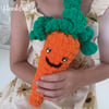A crochet pattern for an amigurumi carrot made with super bulky blanket yarn.