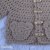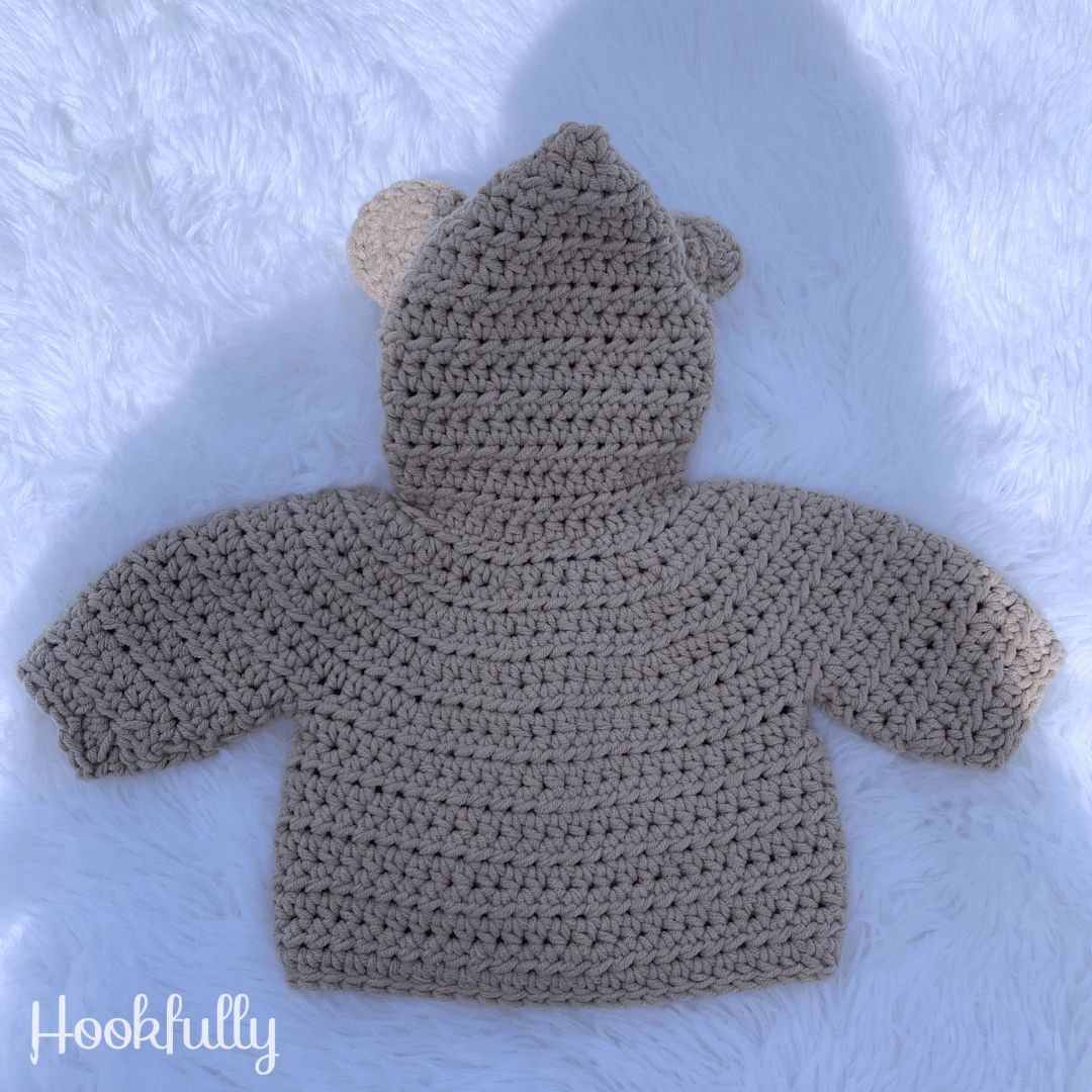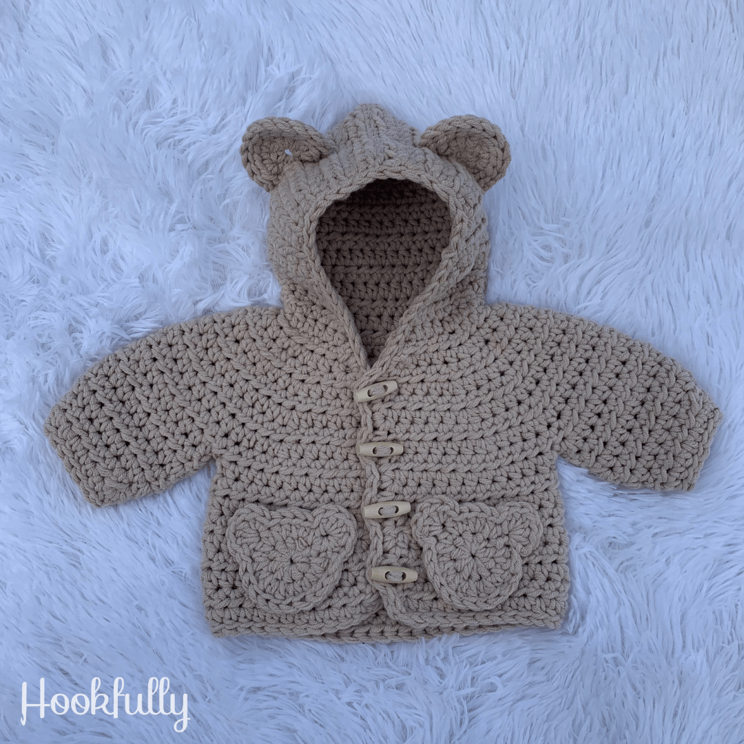 A crochet pattern for hooded baby jacket with bear shaped pockets.