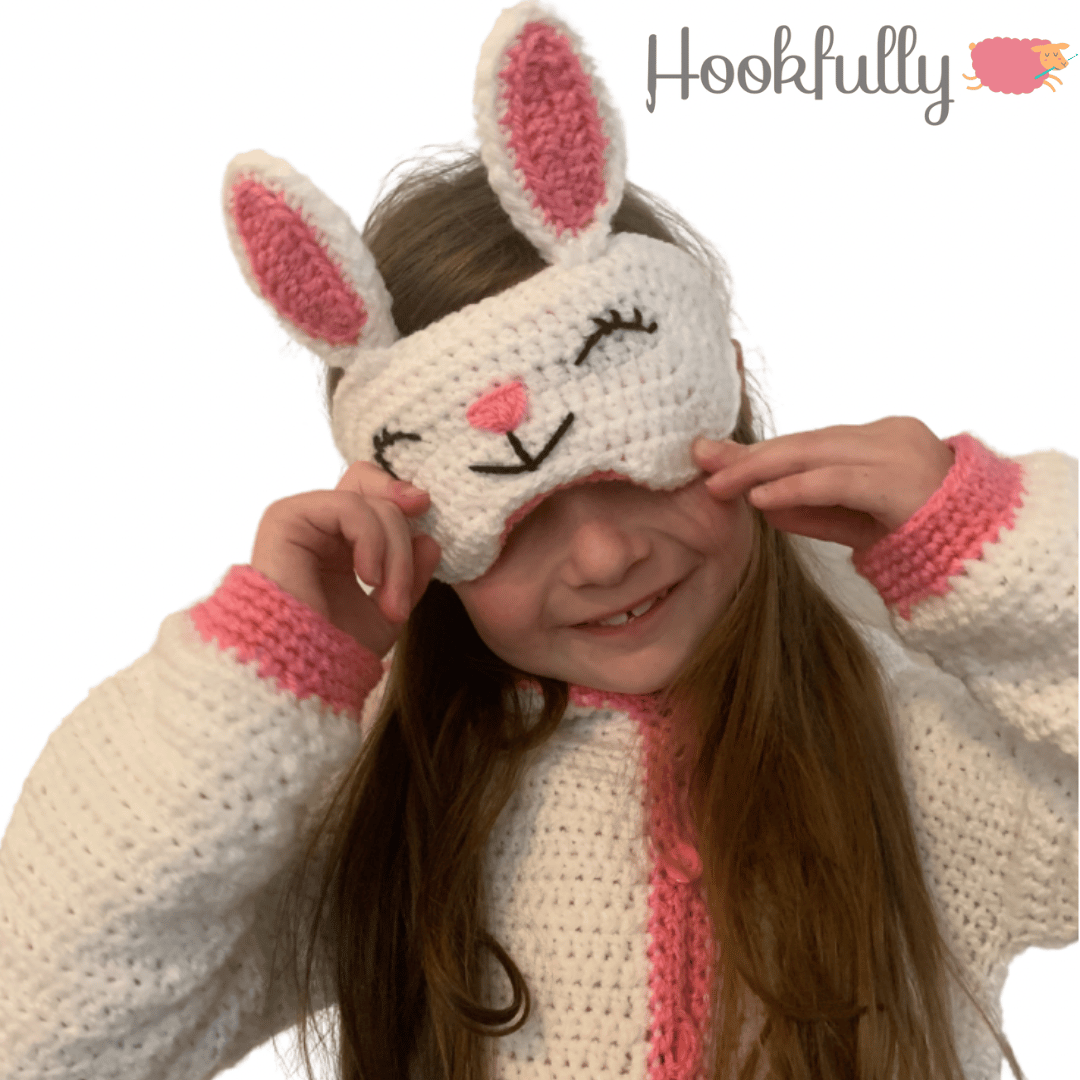 A bunny crochet pattern bundle for bunny onesie designed to fit children aged 2 - 9 years old, a doll onesie for 18" dolls, and a bunny eye mask.