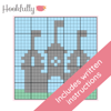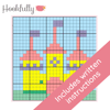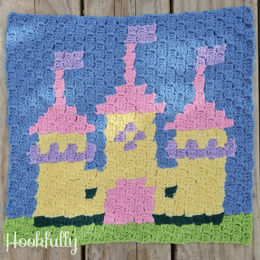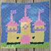 A crochet patterns for a C2C square with a silhouette or colorful castle design, plus instructions on making a pillow, blanket or border.