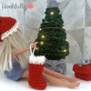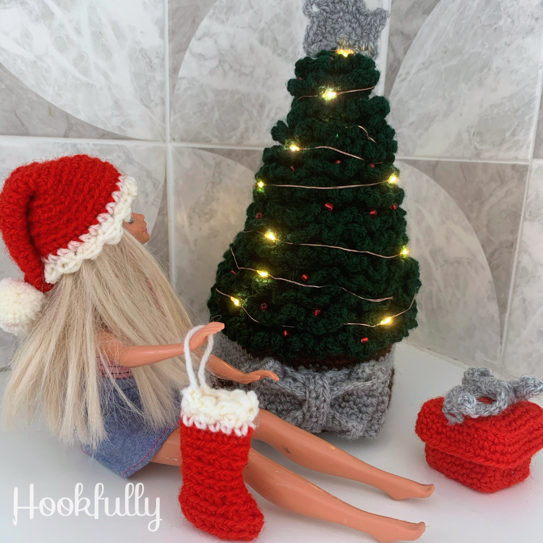 A crochet pattern bundle of Christmas tree, Santa hat, gift box and stocking for 12" fashion dolls.