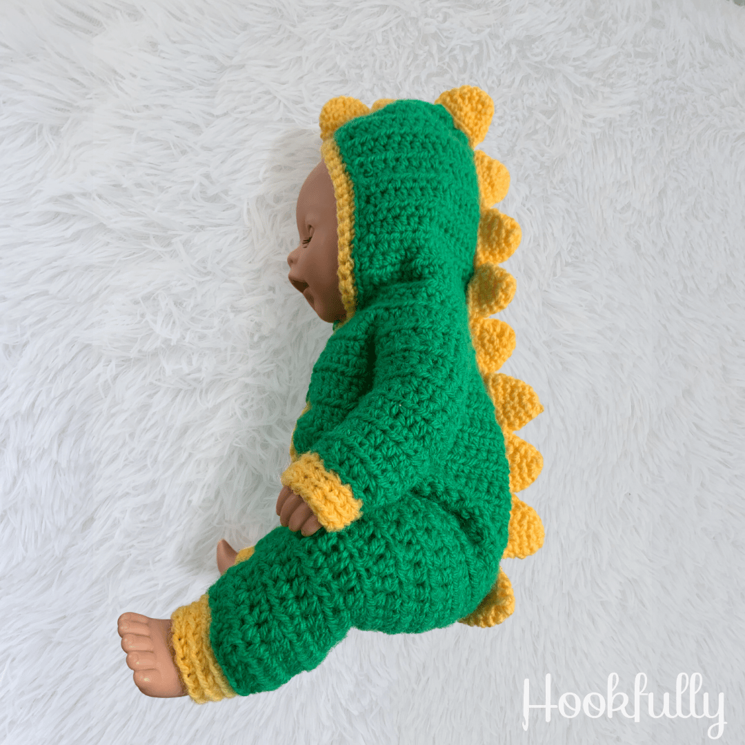 A crochet pattern for a dinosaur onesie designed to fit 14" baby dolls.