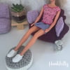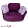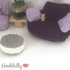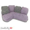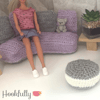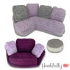 A crochet pattern for a 1:6 scale dollhouse furniture set for 12" dolls including a corner sofa, footstool, and cuddle chair.