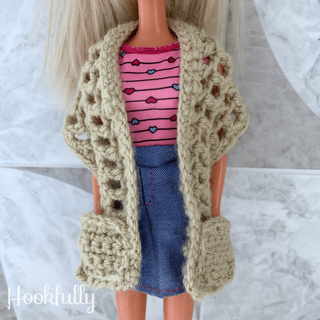 A crochet pattern for a simple pocket shawl designed to fit 12" fashion dolls.