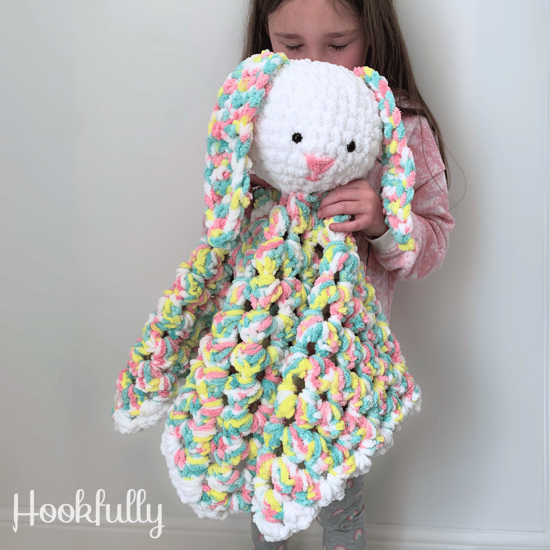A crochet pattern for a giant bunny lovey made using super bulky blanket yarn.