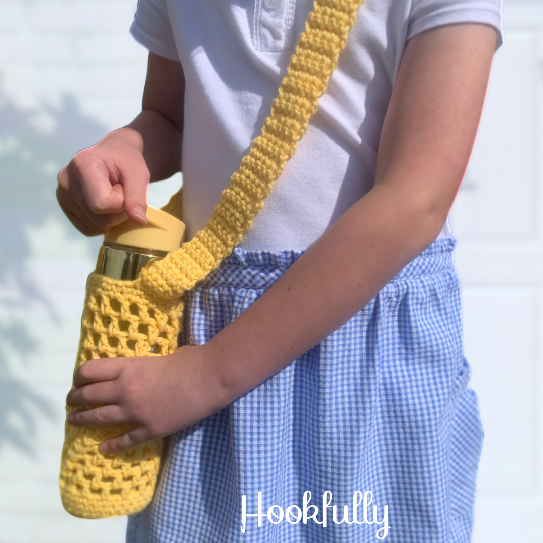 A crochet pattern for a kids bottle bag made with cotton yarn.