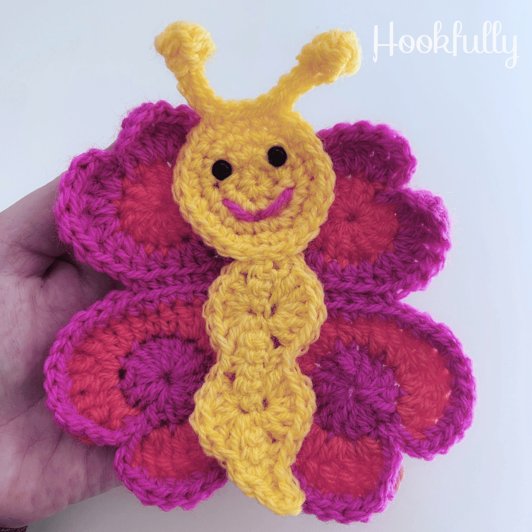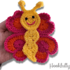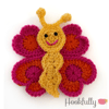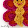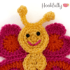 A crochet pattern for a large butterfly applique with heart shaped wings.