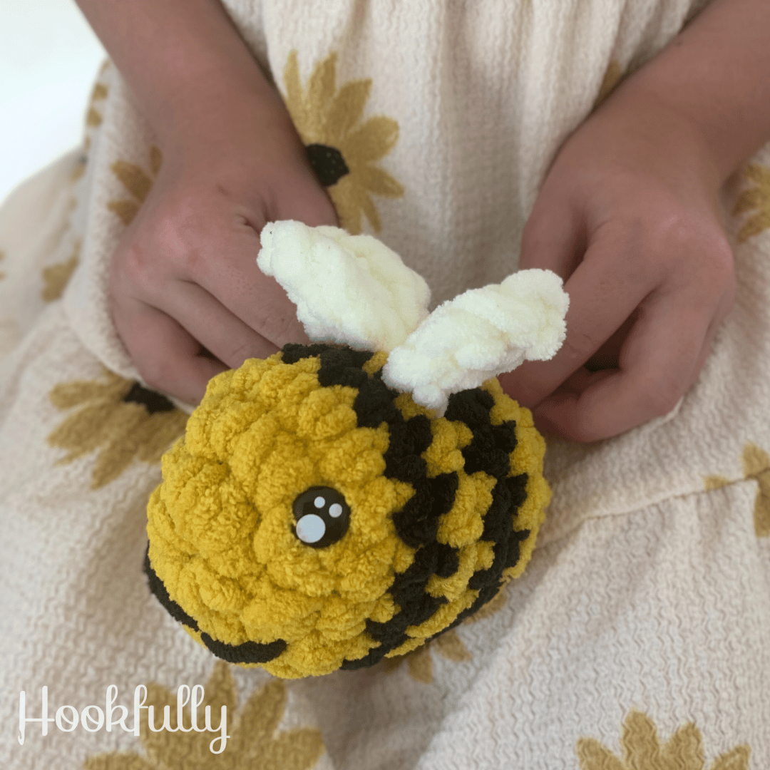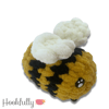 A crochet pattern for a small squishy amigurumi bee.