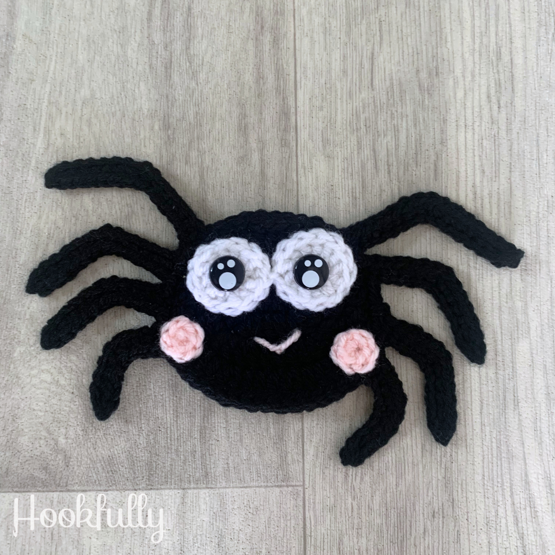 - Free, basic online version on https://hookfully.com/free-crochet-spider-pattern-cute-applique/