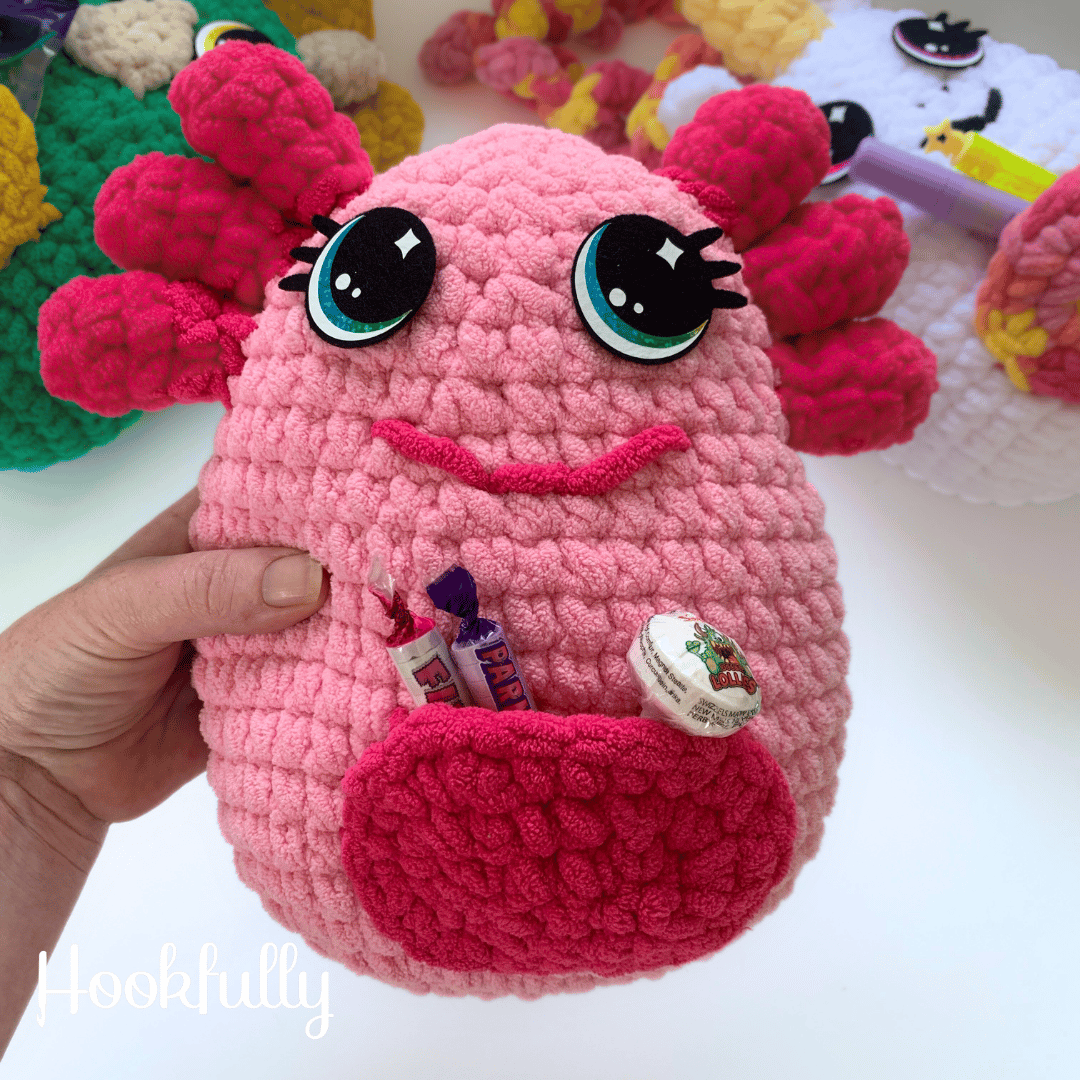 A crochet pattern for a squishy axolotl with a secret tummy pocket.
