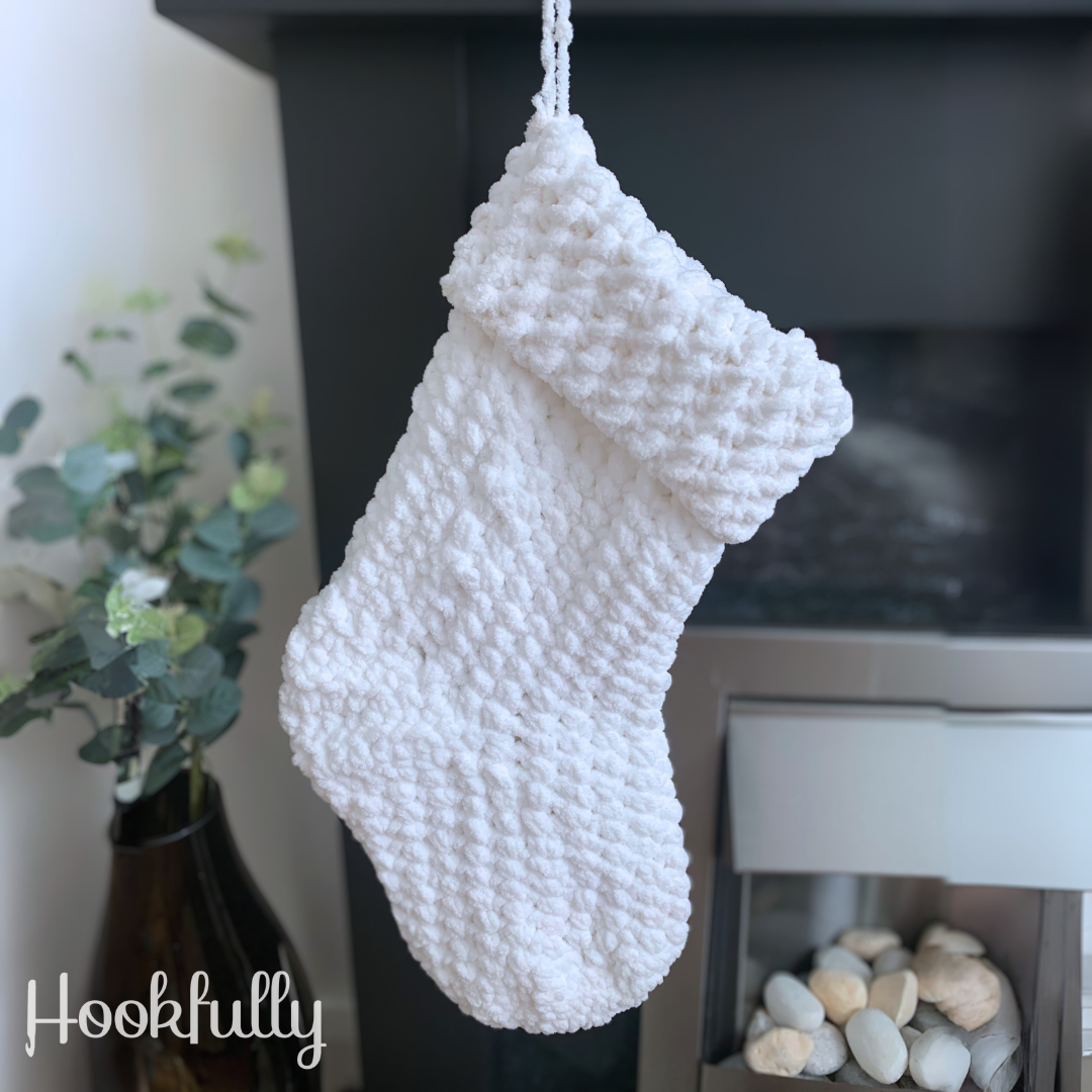 A crochet pattern for a large Christmas stocking made using the Elizabeth (mini bean) stitch.