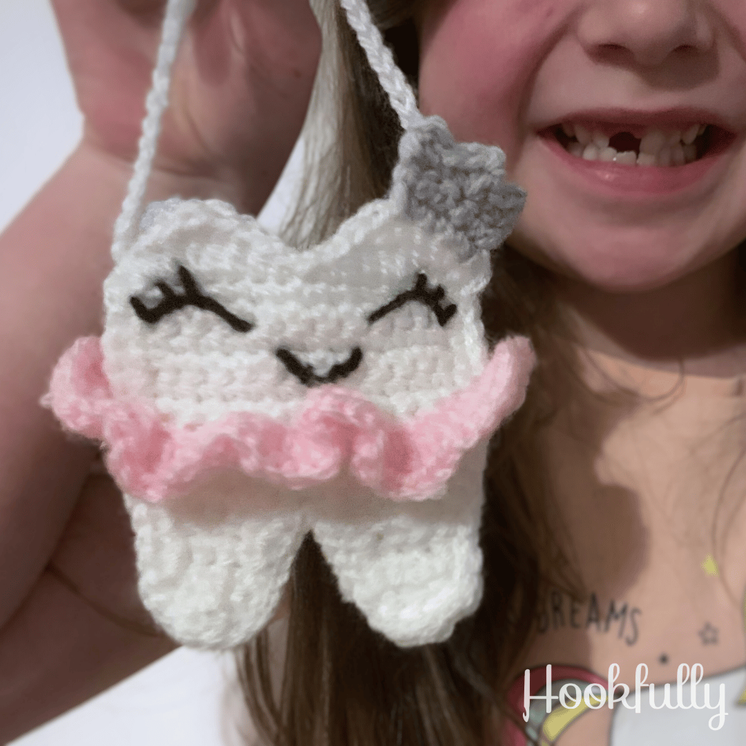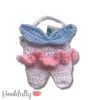 A crochet pattern for a small tooth fairy bag complete with wings, tutu and a crown.
