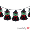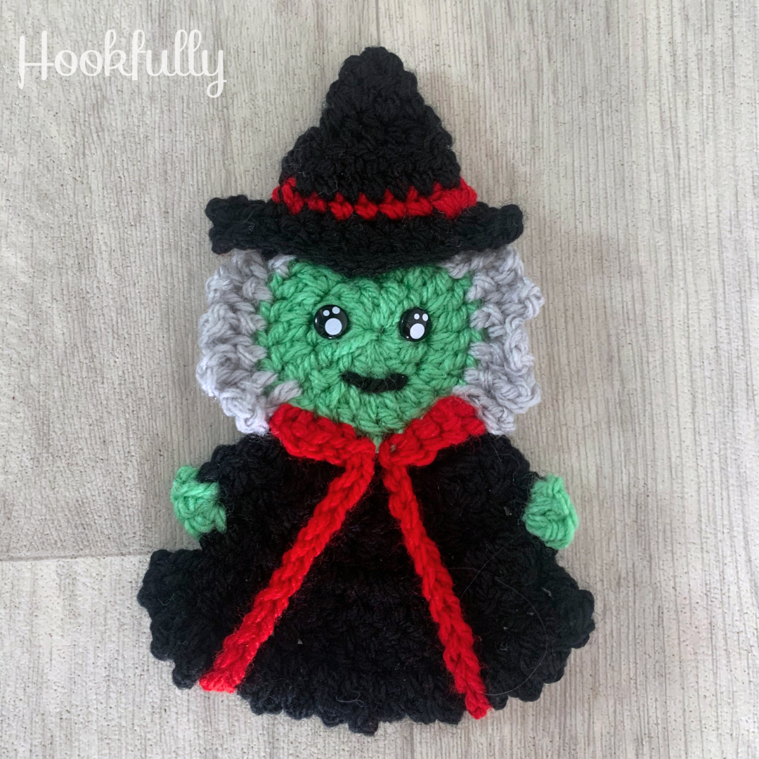 - Free, basic online version on https://hookfully.com/free-crochet-witch-applique-pattern/